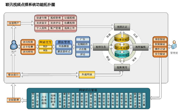 联讯视频点播解决方案基于本公司oVideo视频播客系统、ovServer转码服务器组合。本解决方案基于Windows NT平台,采用Sql server数据库,是国内首款Windows平台下专业视频点播系统。本系统提供了从视频处理到视频分享的快速建站系统。本系统支持国内常见的几十种视频格式,不论是用DV,手机拍摄的,还是从网上下载的电影片段,MTV,都可以将视频媒体文件高效转换为flv格式,高速转换,显示清晰、流畅,用户可以快速有效的对视频文件进行发布和分享。